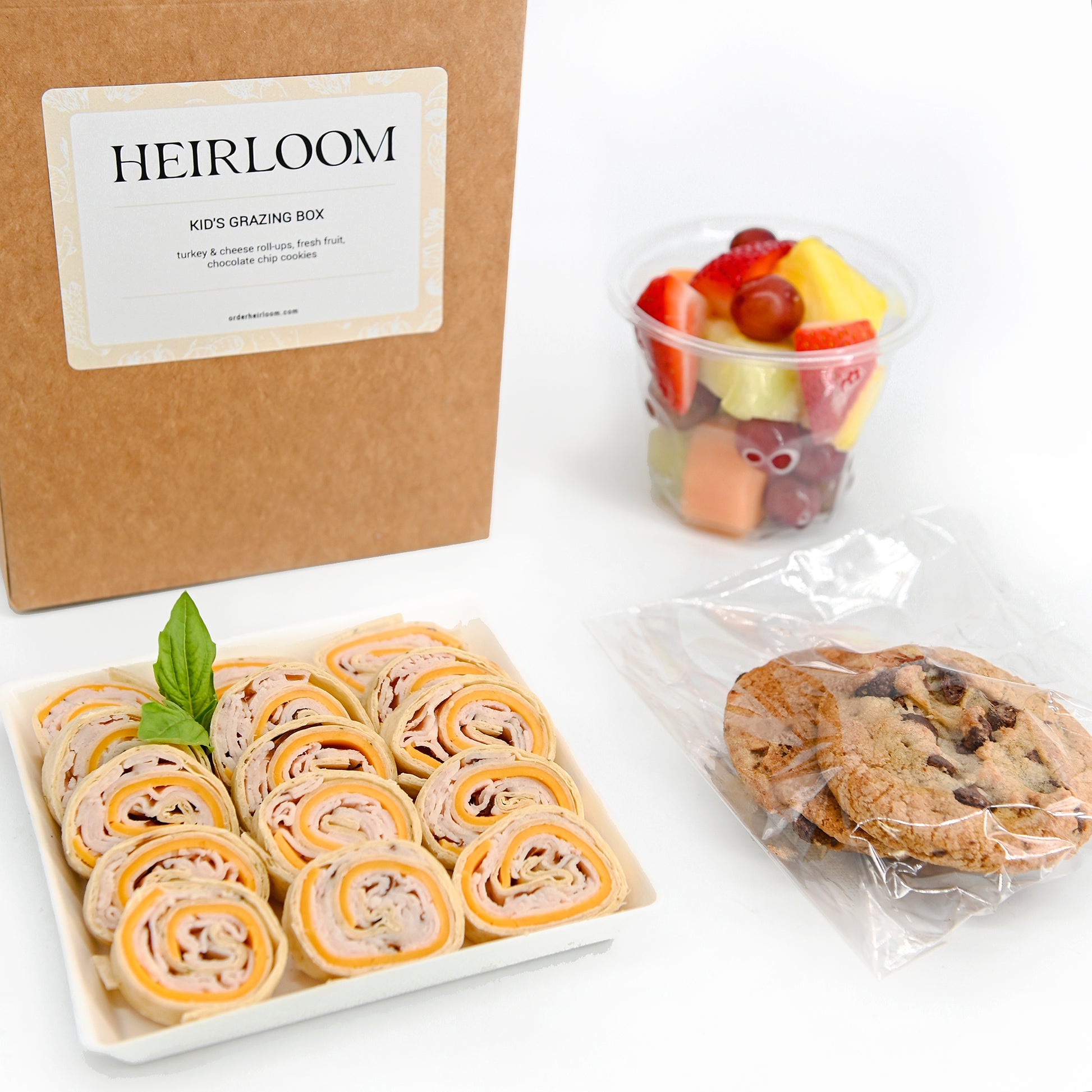 KID'S TURKEY WRAP turkey and cheddar wrap, fresh fruit cup, and chocolate chip cookies