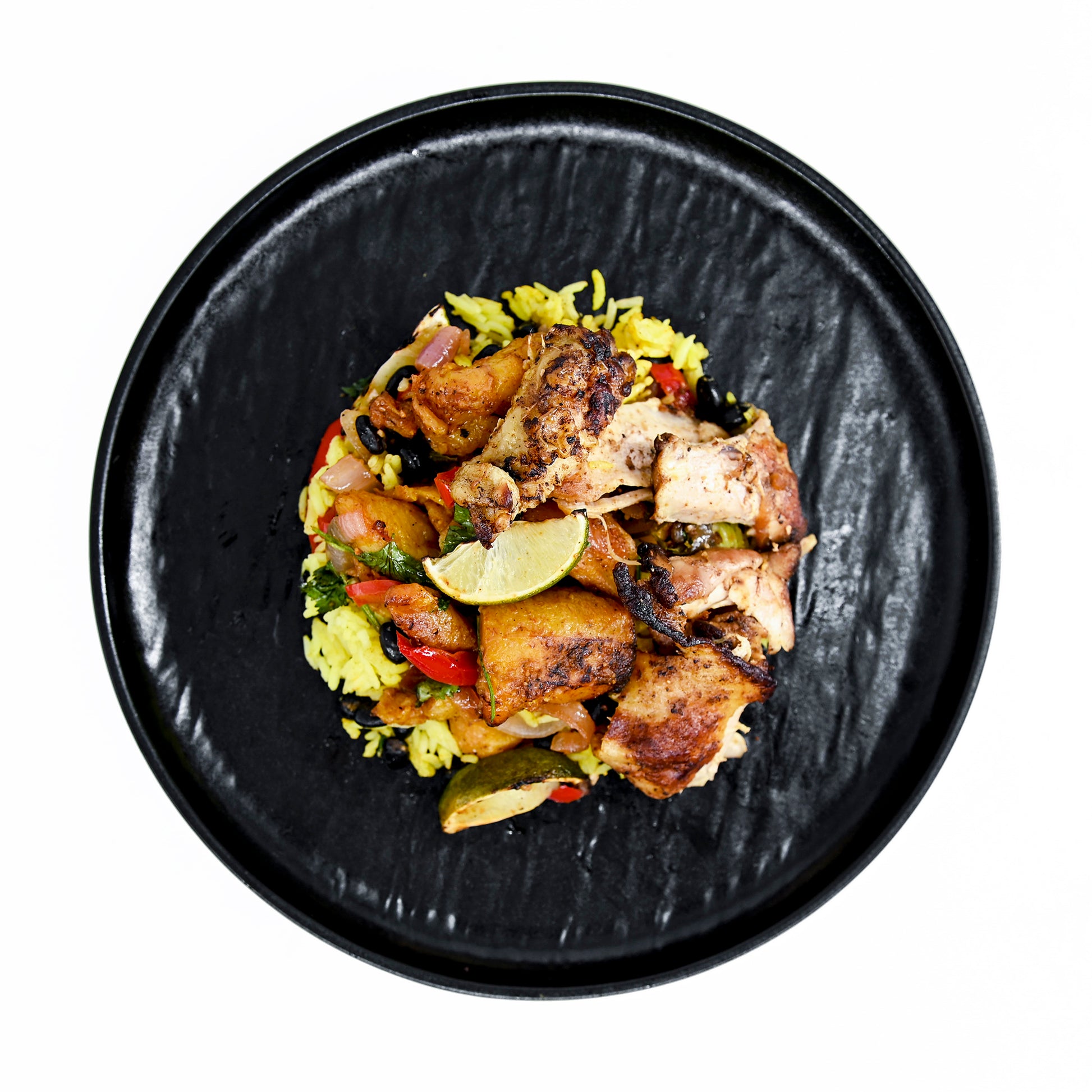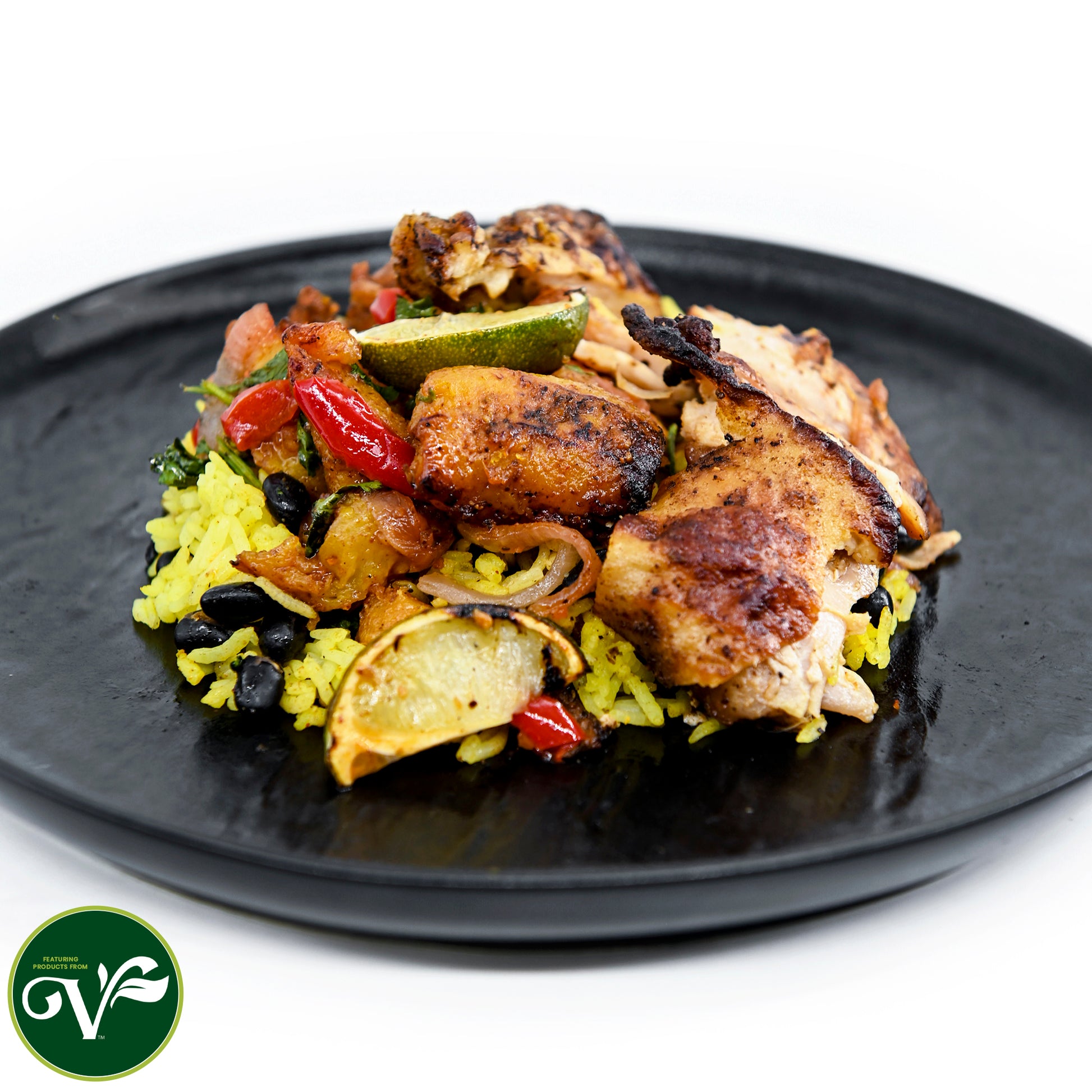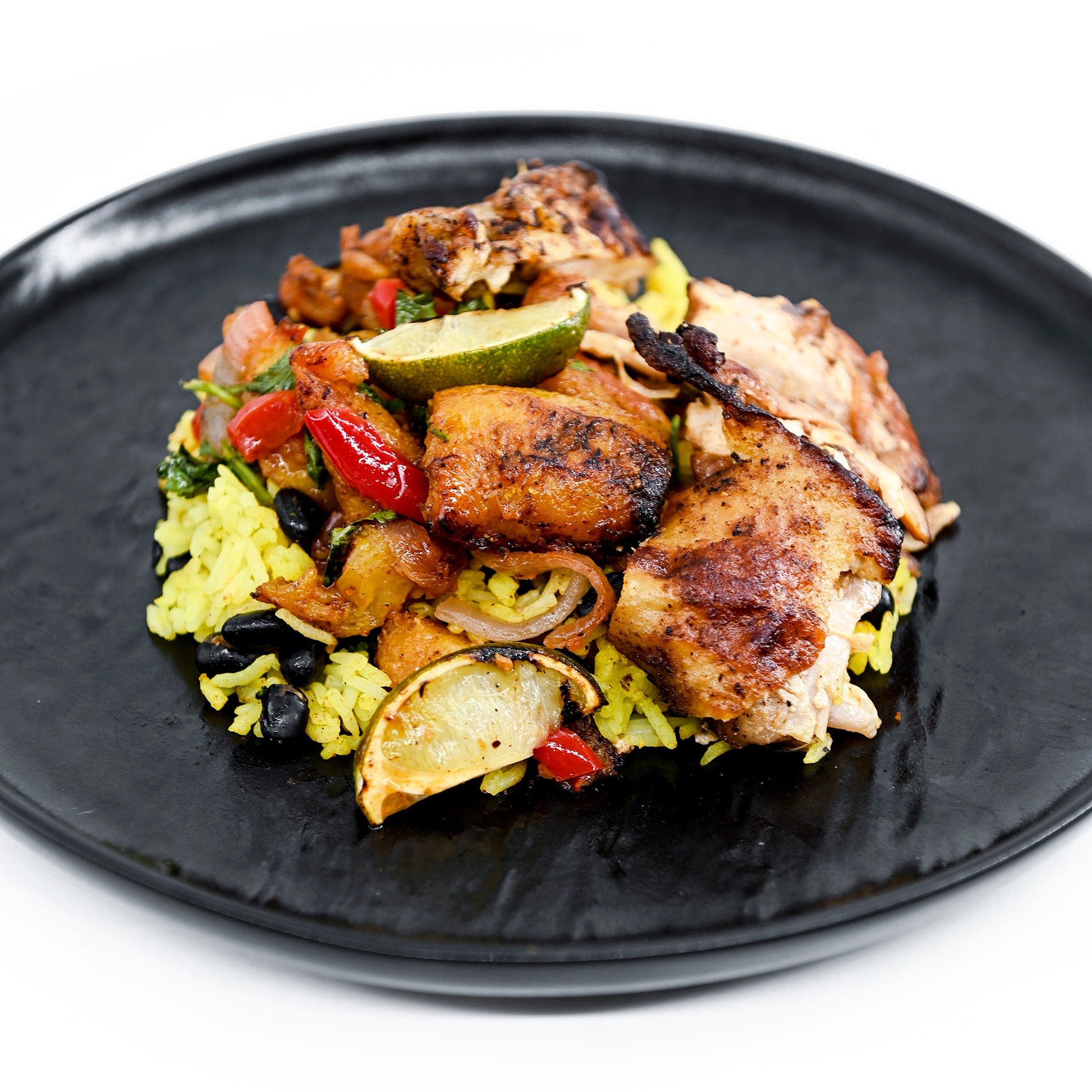 mojo chicken, calabacitas, yellow rice and beans, cilantro