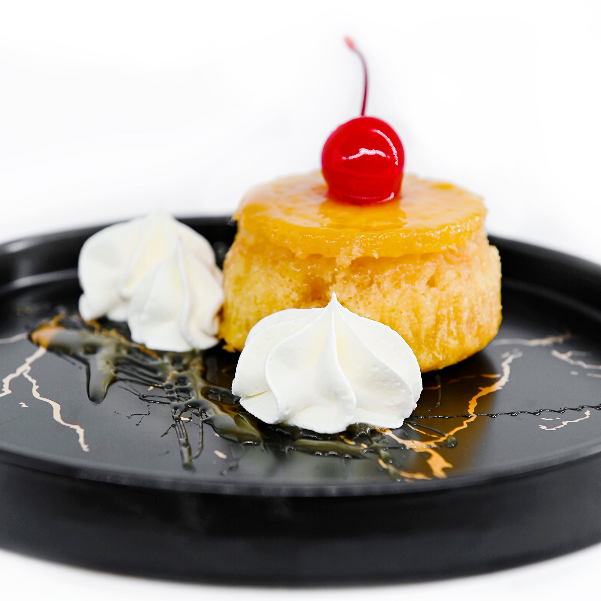 pineapple, yellow cake, brown sugar, maraschino cherry, whipped cream