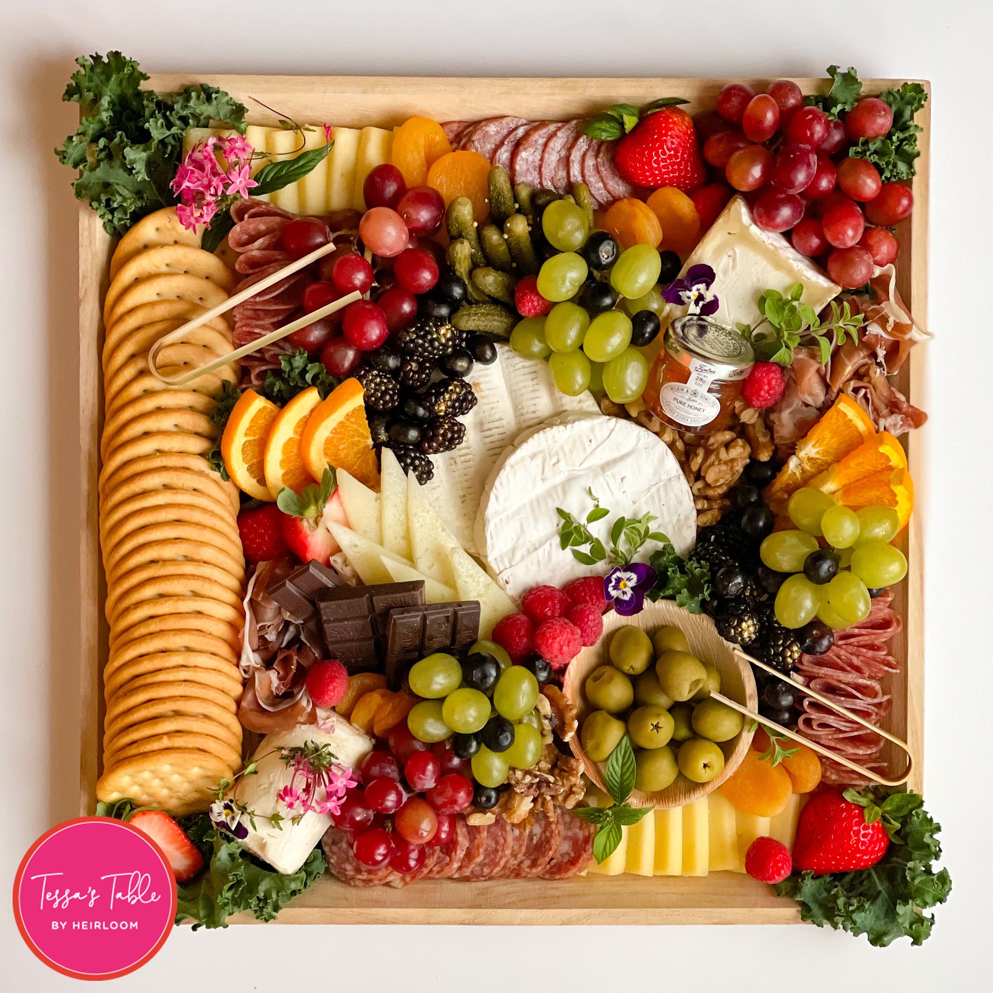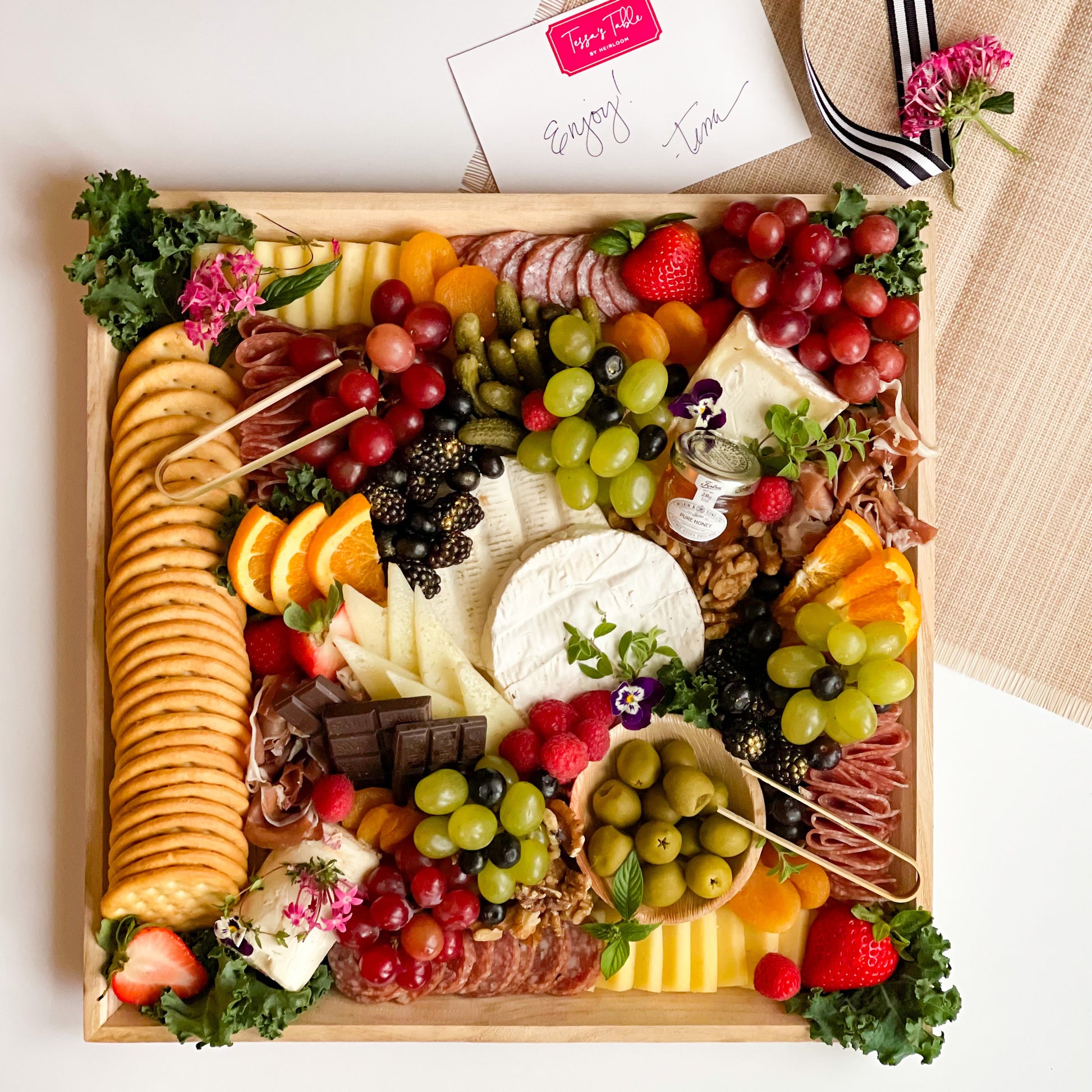 Tessa’s Table Grazing Board features artfully placed cheeses, cured meats, seasonal fruit, crackers, olives, nuts, chocolates, and honey with a sprinkling with edible florals.This board is perfect for feeding 10-12 people. Serves well as an appetizer portion. Refrigerate upon arrival. Best if served on the day of delivery.Items included on this board may be adjusted based on seasonality. Board dimension: 16” x 16”