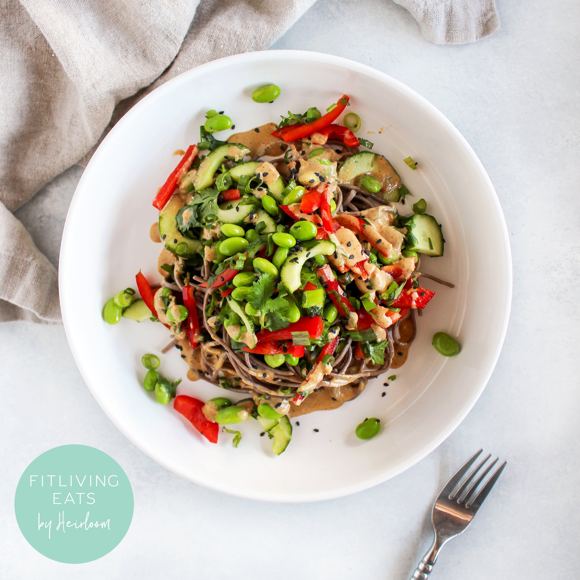 1X THAI ALMOND SOBA NOODLE BOWL buckwheat soba noodles served chilled tossed in a thai almond sauce with red bell pepper, cucumber, edamame, scallion, and cilantro