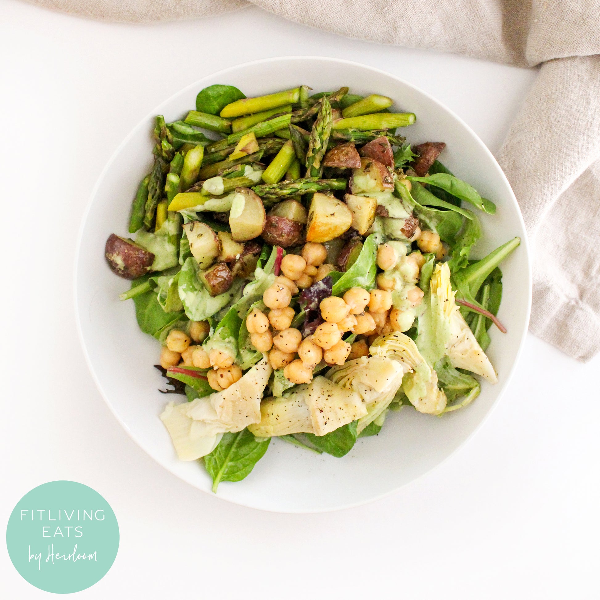 garbanzo beans, roasted potatoes, artichoke hearts, roasted asparagus, spring mix lettuce, dressing