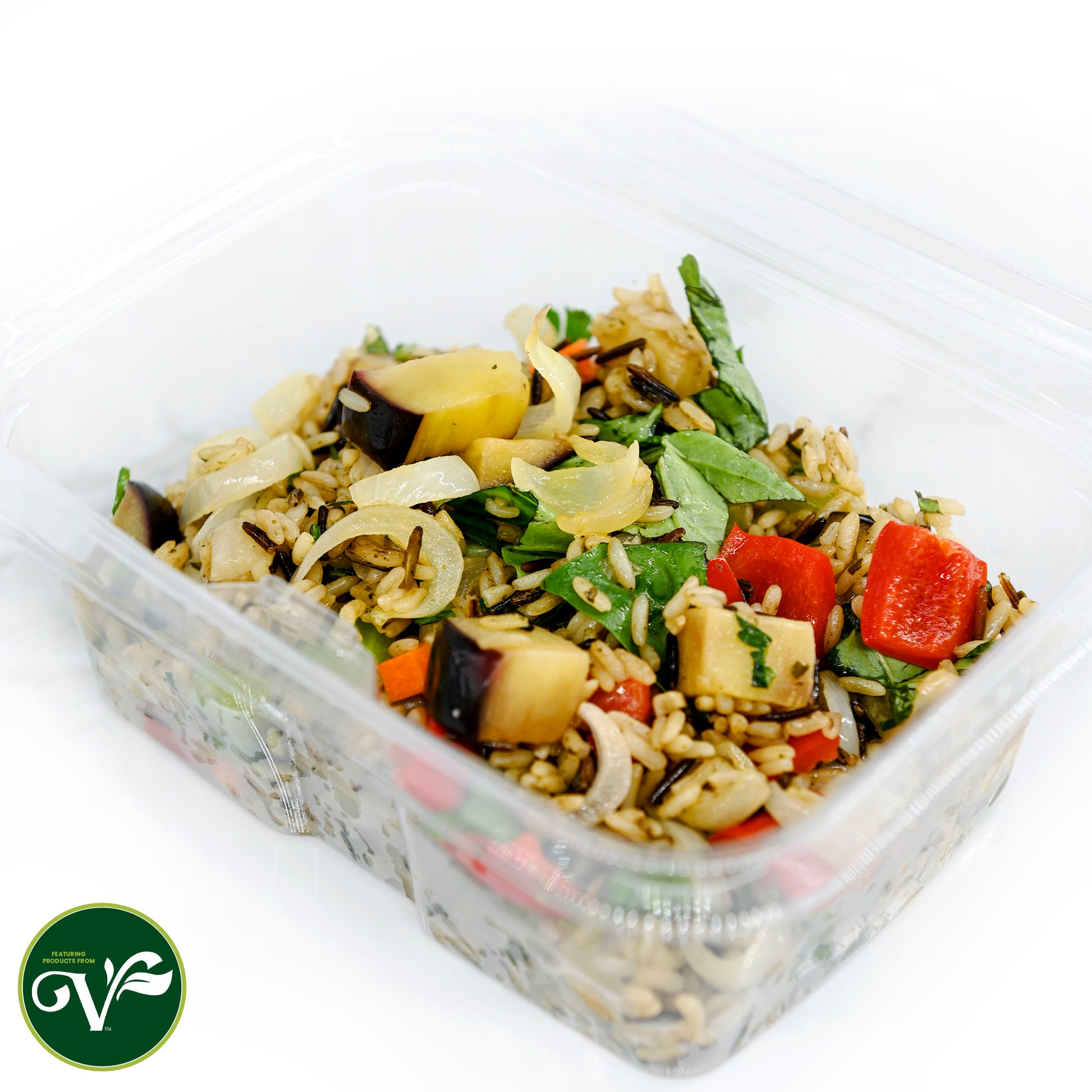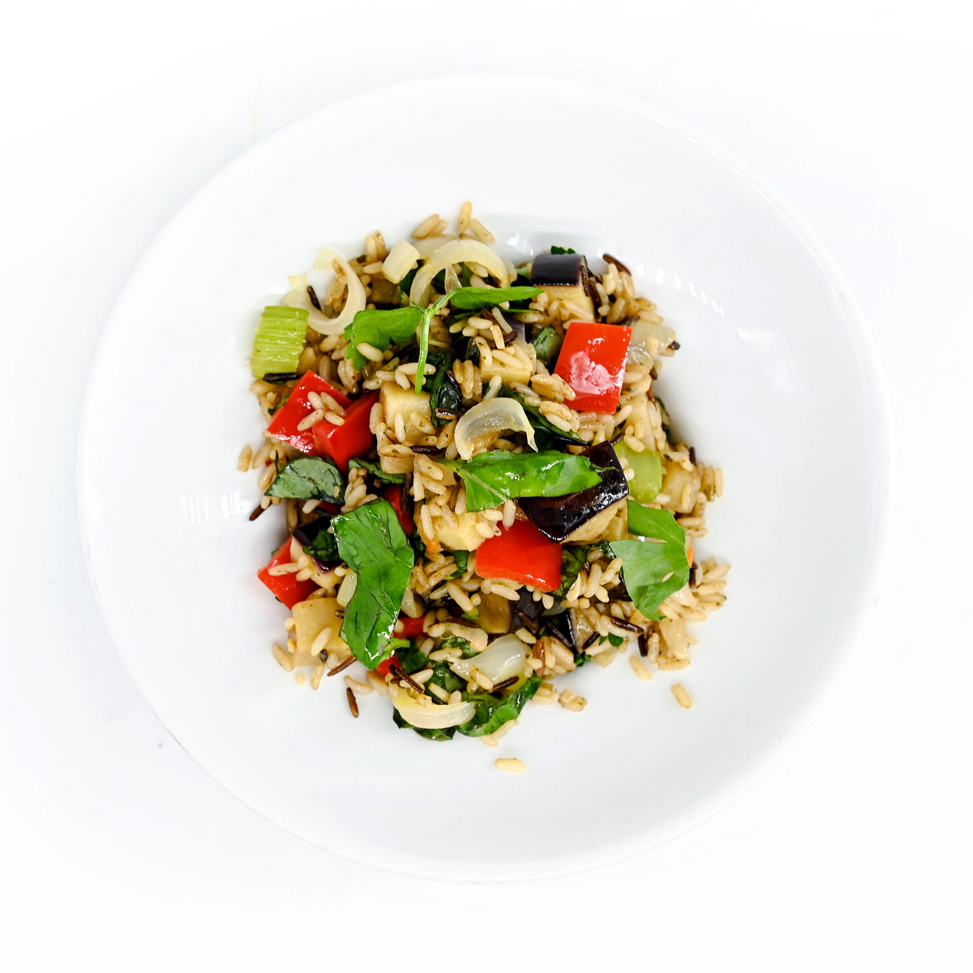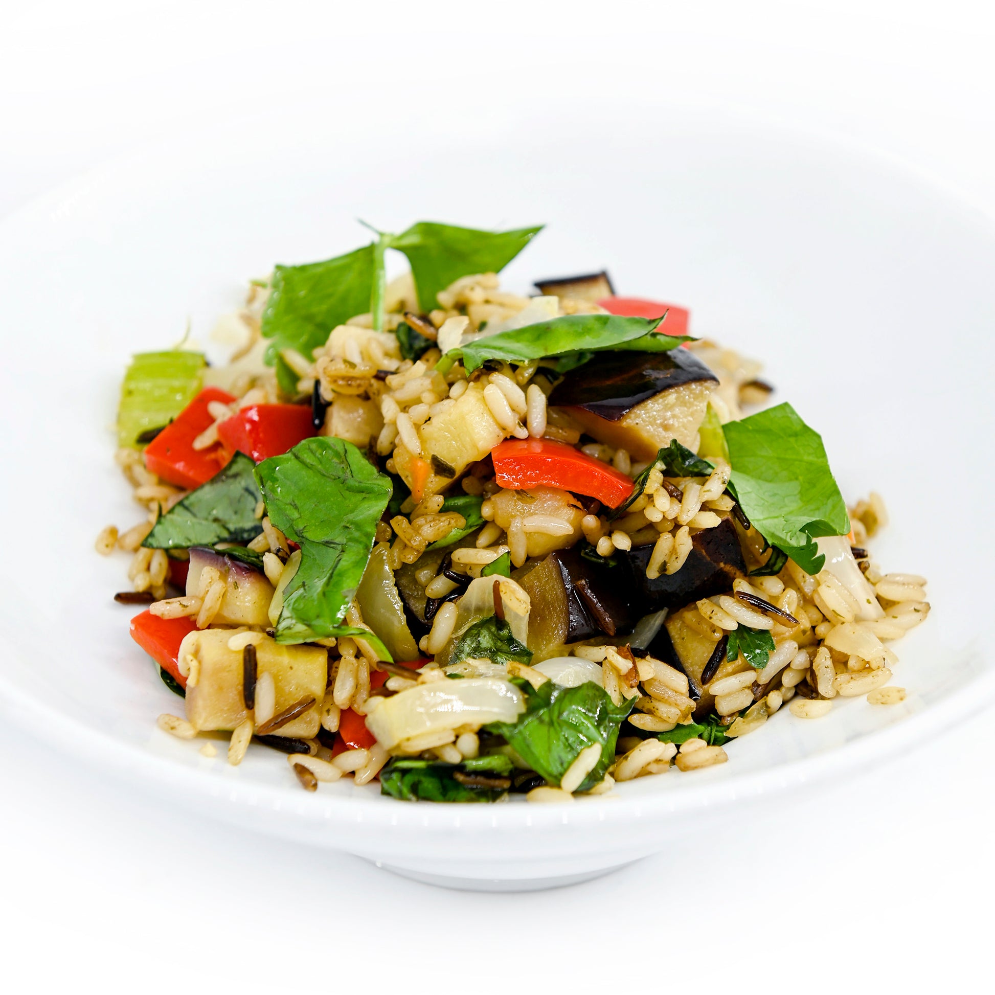 rice pilaf, charred eggplant, peperonata, red pepper, onions, torn herbs