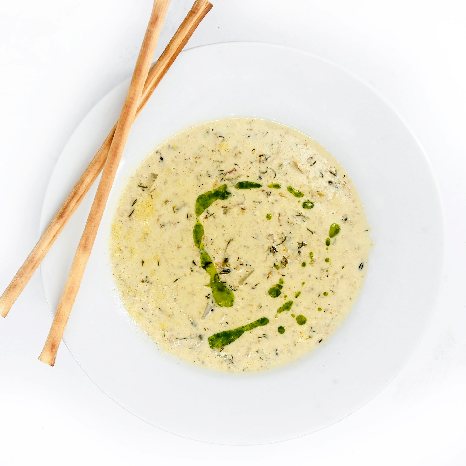 clam chowder with celery, onion, garlic, bacon, potato, herbs and spices