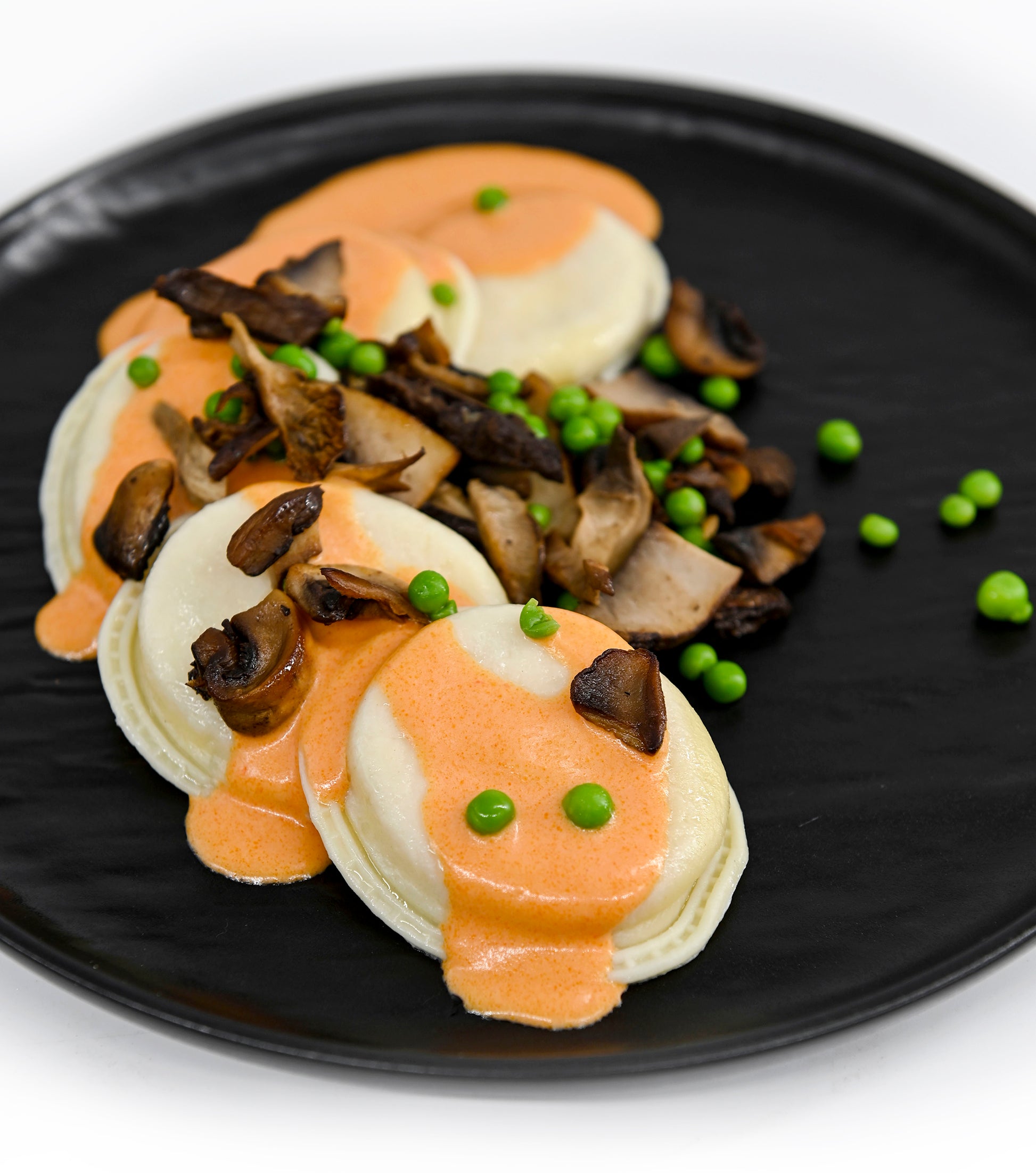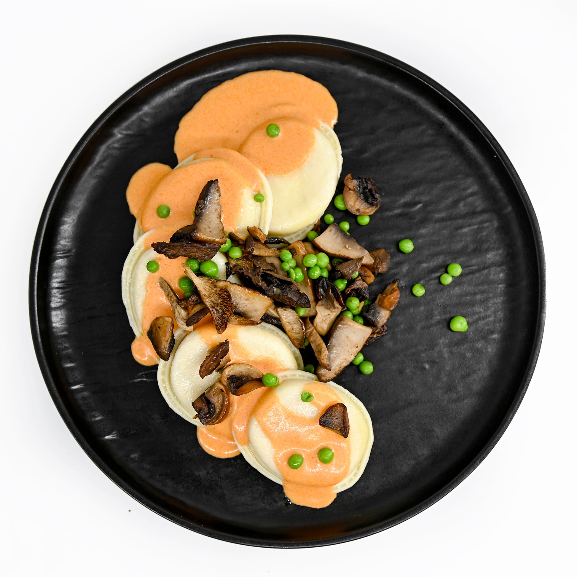 three cheese ravioli, mushrooms, peas, pepper cream sauce
