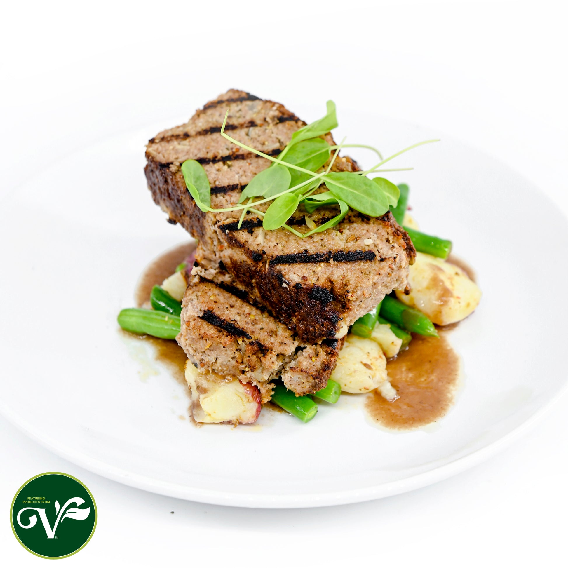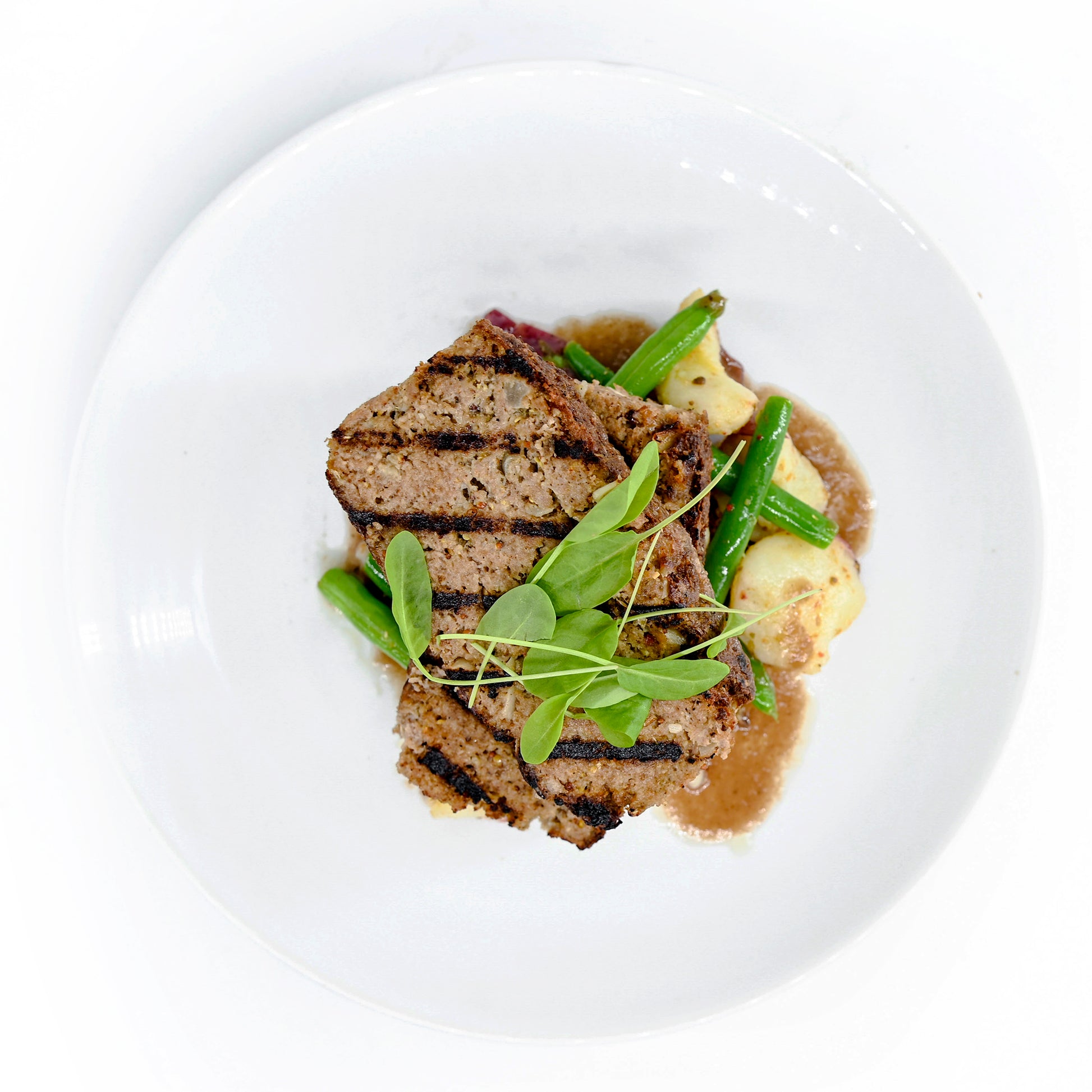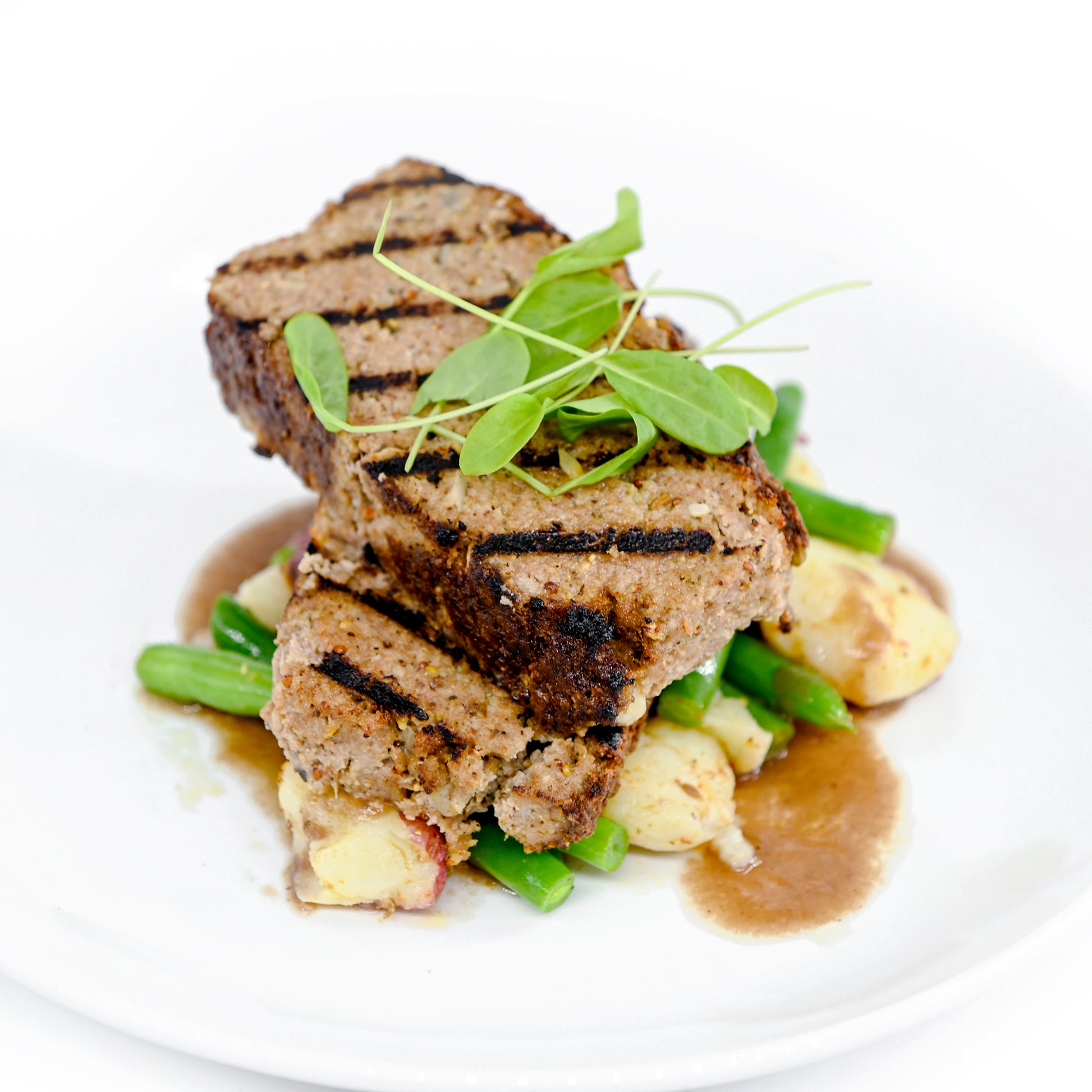 turkey meatloaf, the villages grown roasted tomato, garlic potato, green beans
